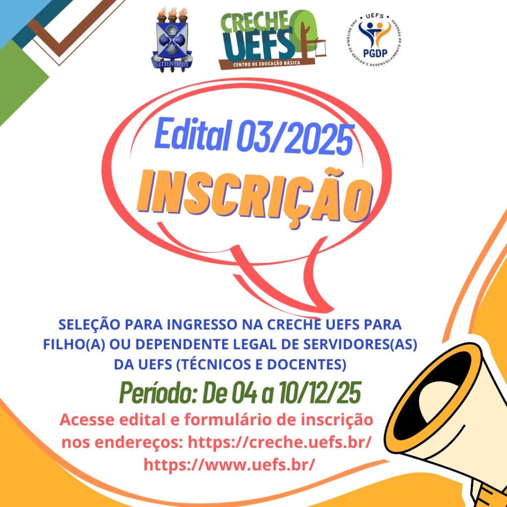 EDITAL 003/2025SELEÇÃO PARA INGRESSO NA CRECHE DO CENTRO DE EDUCAÇÃO BÁSICA PARAFILHO(A) OU DEPENDENTE LEGAL DE SERVIDORES(AS) DA UEFS (TÉCNICOS E DOCENTES)